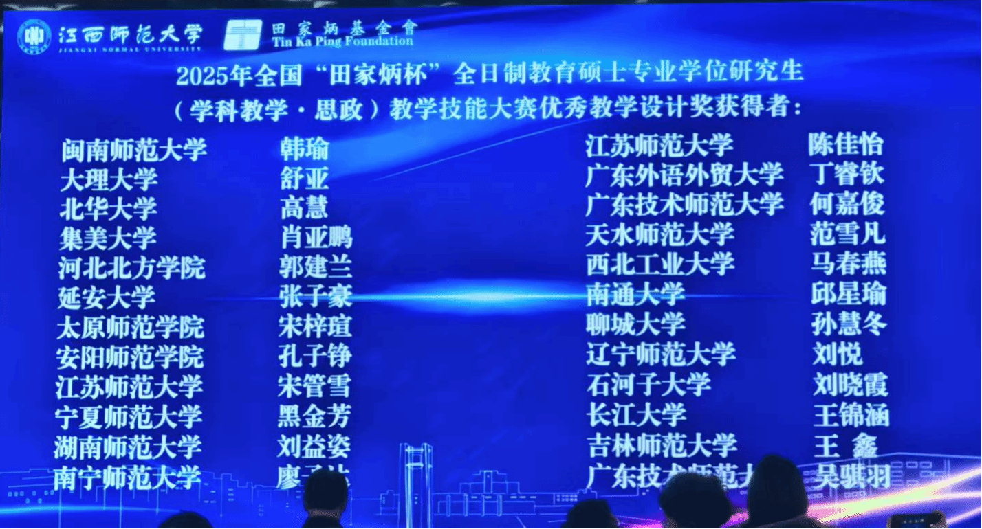 大赛由田家炳基金会冠名,江西师范大学主办,吸引全国 120余所高校参与,254名选手晋级决赛,是全国学科教学(思政)领域极具权威性的赛事,被誉为思政教育硕士培养质量的 “试金石”。赛事分为初赛与决赛两个阶段,初赛要求提交初高思政统编教材相关教学设计与15-20分钟授课视频,决赛采用“现场抽题+ 90分钟封闭备赛(含课件制作)”模式,现场完成10分钟模拟授课、3分钟设计阐述及3分钟答辩。