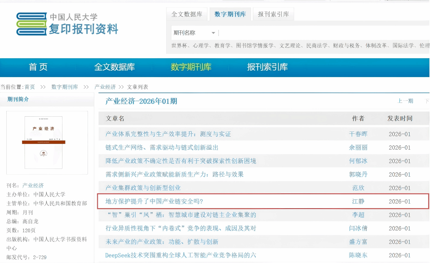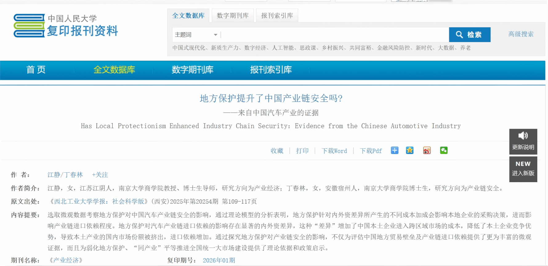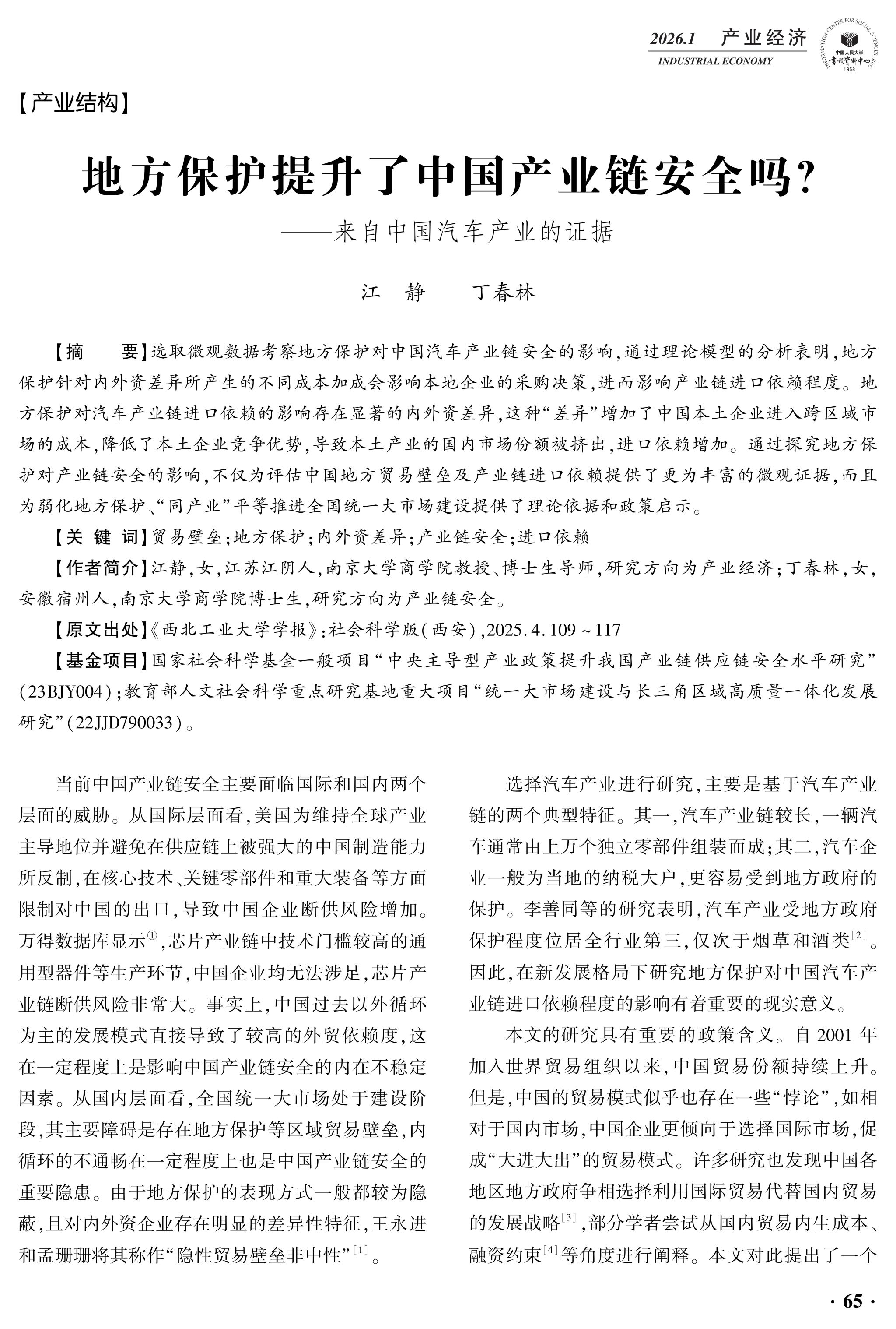 近日,中国人民大学复印报刊资料《产业经济》(2026年第1期)全文转载了《西北工业大学学报(社会科学版)》2025年第4期刊发的南京大学商学院江静、丁春林撰写的论文《地方保护提升了中国产业链安全吗?——来自中国汽车产业的证据》。